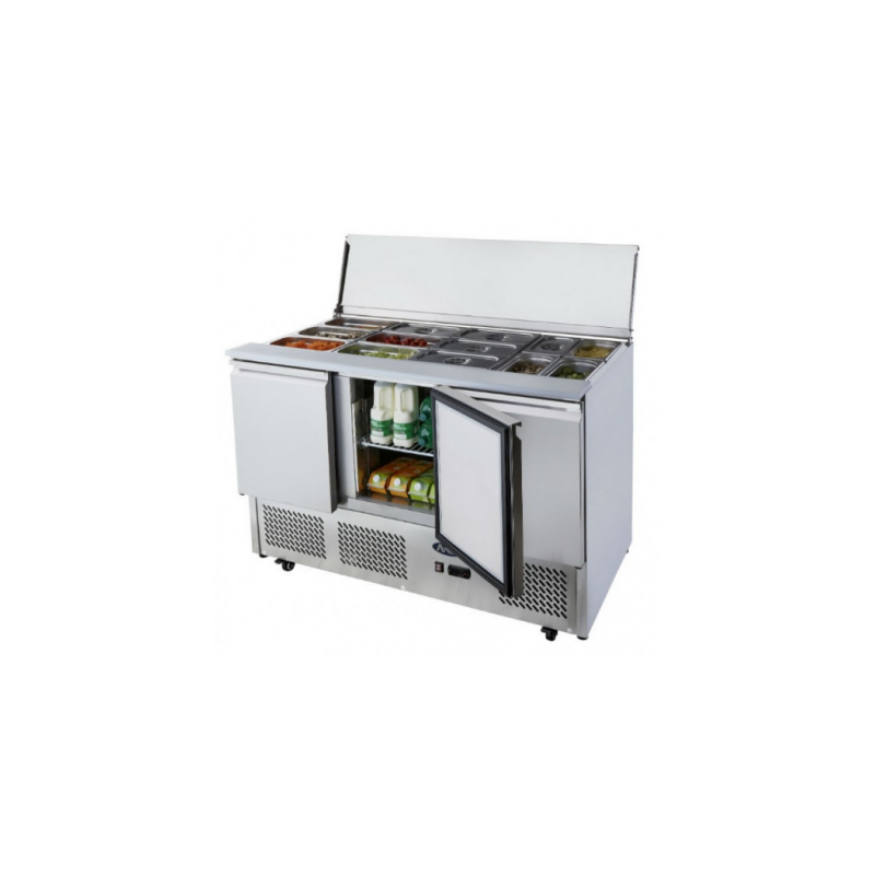 The Ice-A-Cool ICE3850GR Three door saladette counter is a compact and tidy refrigerated counter which can fit perfectly into any business looking to store refrigerated goods.It is a large preparation counter which gives you 6 shelves and capacity for 12 x 1/3 GN pans, supplied.