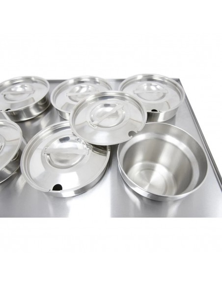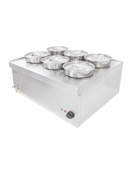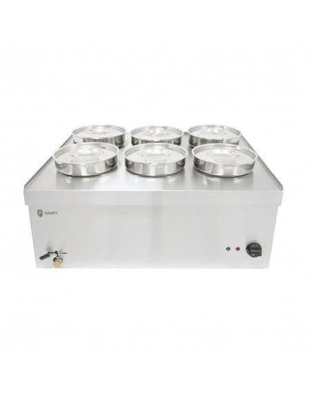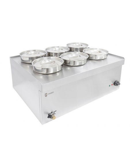 The Parry NPWB6 made from high grade stainless steel this UK manufactured NPWB6 Parry Bain Marie comes readily supplied with four circular pots for storing of hot food and vegetables, as well as for the preparation of sauces and custards for use in buffets and self service environments. The temperature is easily modified through the front manual dial to complement your choice of food, soup or sauce.