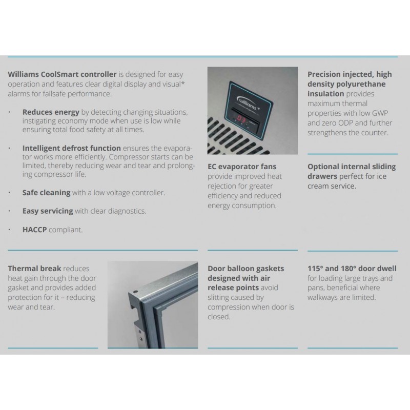 Combining convenience and efficiency, this stylish 4 door counter from Williams features CoolSmart technology for increased efficiency saving up to 15% in energy. Please note that gastronorm pans sold separately.