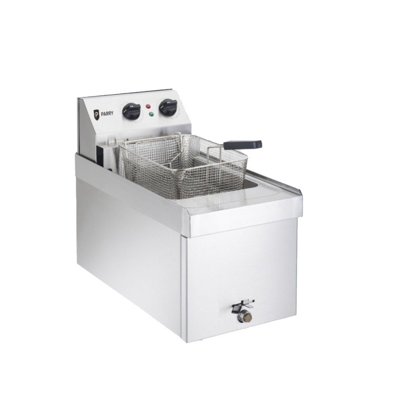 The Parry NPSF9 Single Electric Fryer has a thermostatic control safety thermostat and is supplied with a traditional wire basket. The unit has a batter plate and is fitted with a front drain tap.