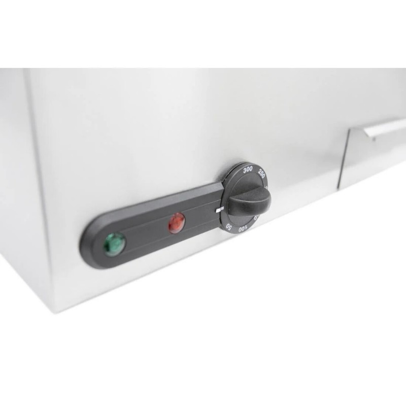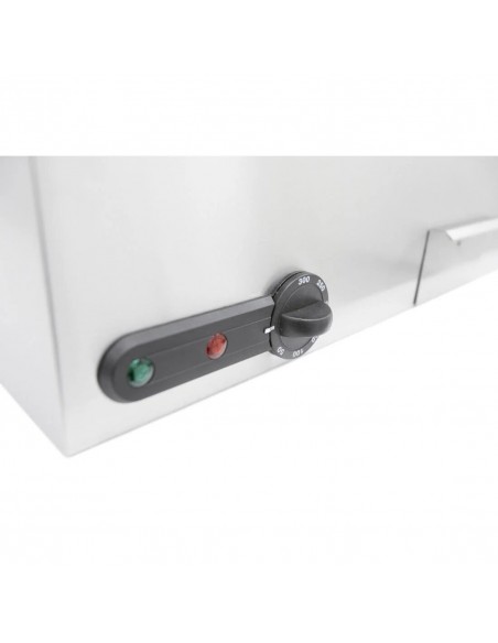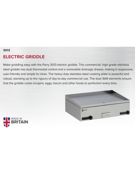 The Parry 3013 Large Electric Griddle has a strong stainless steel construction and a solid steel cooking plate which ensures good heat distribution and retention. The griddle has a removable fat drainage drawer for easy cleaning.