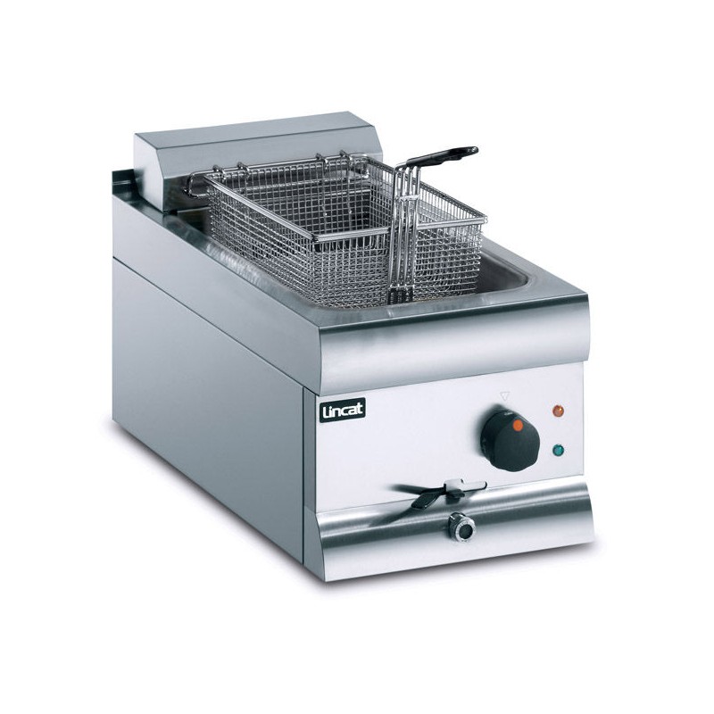 The Lincat DF33 is a high quality electric counter-top unit from Lincat’s Silverlink range of modular kitchen equipment. The unit is ruggedly constructed easy to clean and packed with simple but effective design features to ensure easy use and good cooking results with front mounted controls and drain tap for straightforward and safe operation. The thermostatic temperature control and deep cool zone for collection of sediment ensure good quality results – 3kw power makes for quick temperature recovery which also enhances the crispness of batter.
