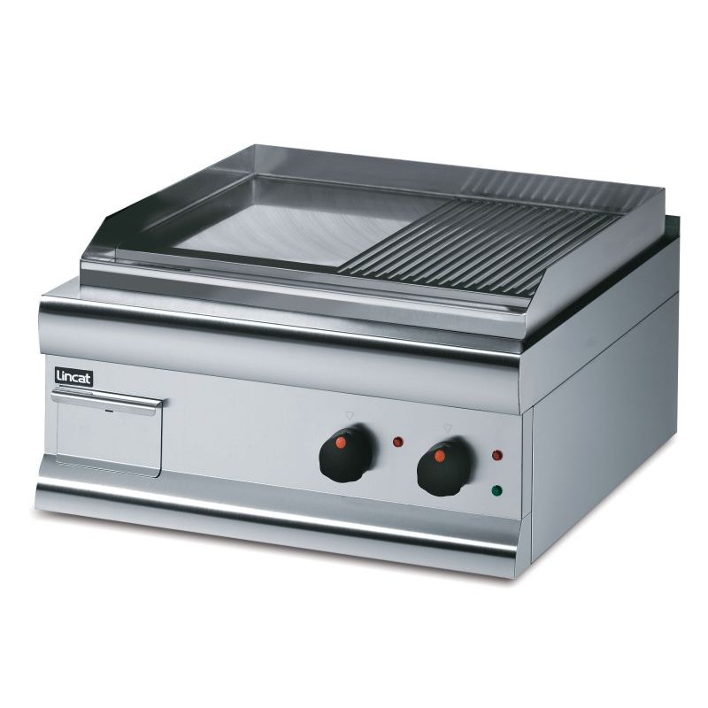 The Lincat GS6/TR half ribbed griddle is a counter top electric griddle which has a smooth machined cooking surface where half is ribbed. A griddle that is capable of producing 130 x 4oz burgers from frozen per hour and 110 x 8oz medium cooked steaks per hour.