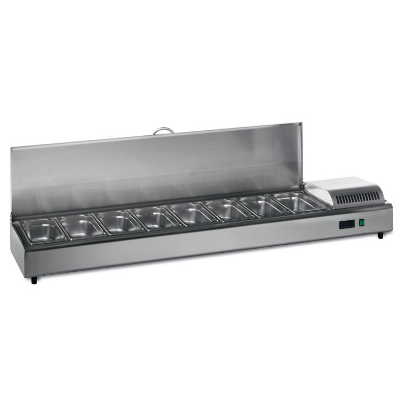 The Lincat FDB8 is a robust hygienic and easy to clean food display bar. It is pictured with a stainless steel lid.
