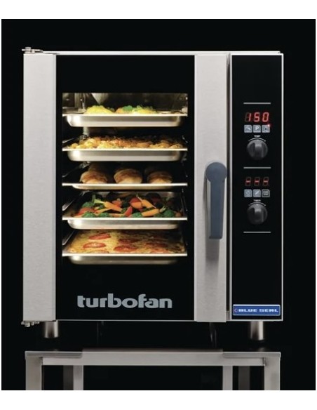 The continued expansion of the bake fresh daily market and convenience food on the go demands have led Blue Seal to create their Turbofan range of convection ovens and provers: new space saving designs of high performance appliances with exceptional functionality. This Blue Seal Turbofan oven is a 5 tray GN 1/1 digital electric convection oven with the industrys leading technology and its smallest footprint: the width is just 610mm.