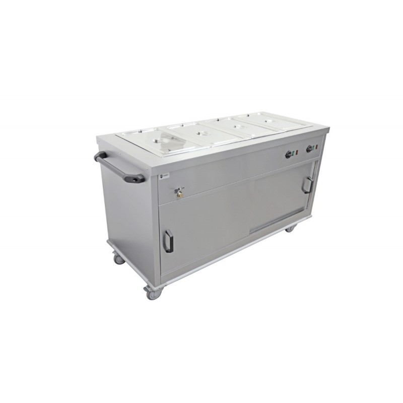 The Parry HC-HOT15BM Hot Cupboard With Bain Marie Top has a strong stainless steel construction the unit has 4 strong castors where 2 are lockable. Built with removable sliding doors for easy cleaning! The hot cupboard has double skinned doors and walls and is temperature regulated throughout by thermostat. Accepts 4 x 1/1 size gastronorms.
