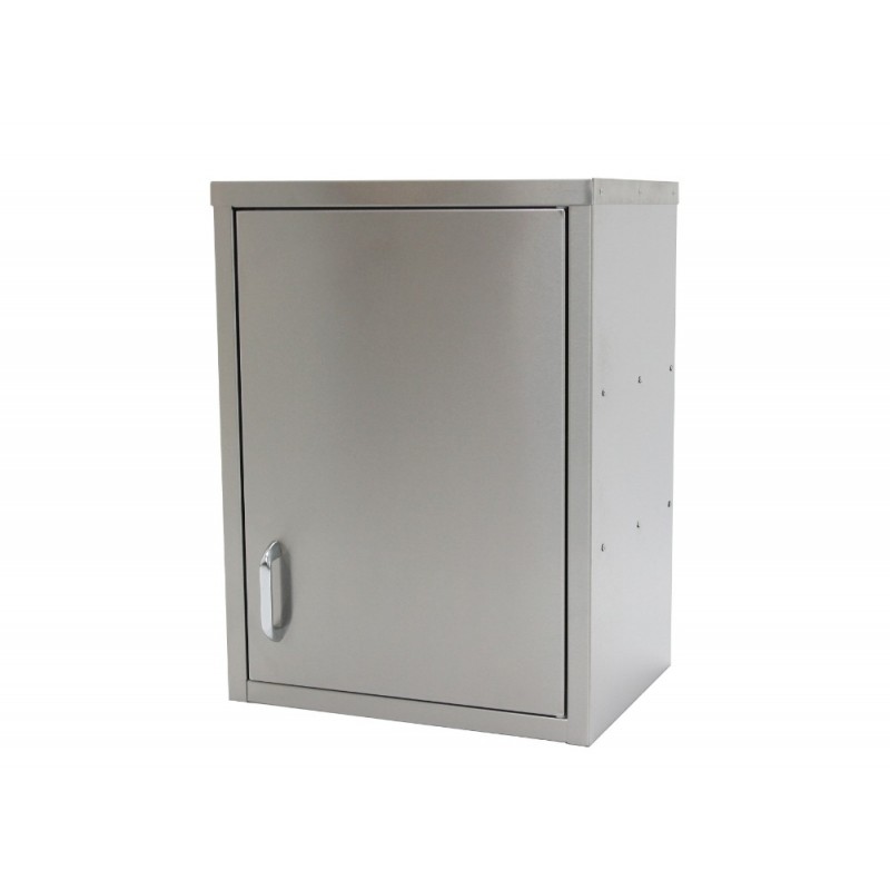 Heavy duty hinged wall cupboard manufactured from high grade stainless steel and comes with one internal shelf.
