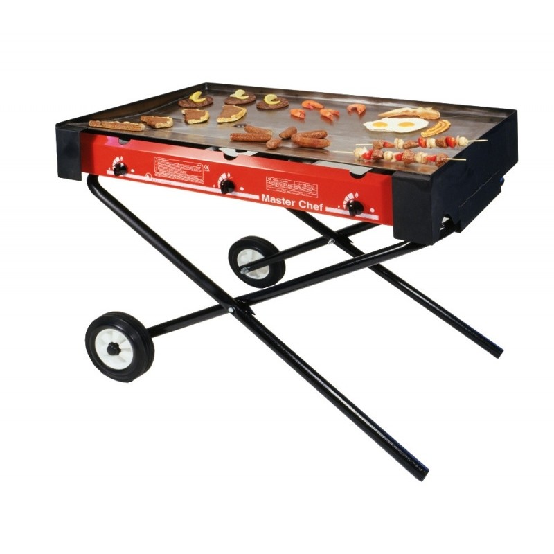 This 15kw three burner catering gas barbecue griddle is well fabricated with heavy gauge sheet steel for the griddle plate. The four tubular legs fold up for transportation and the whole burner unit is pre-assembled for instant use.