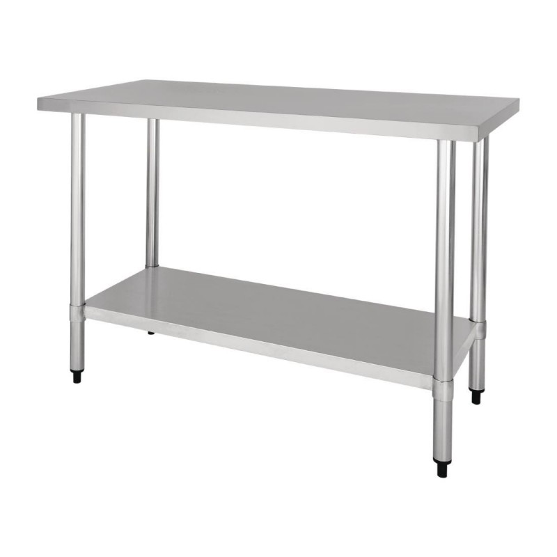 Featuring a stainless steel worktop top, galvanised steel legs and undershelf, this kitchen prep table from Canteen is extremely durable and able to withstand daily use in busy commercial kitchens The prep table can be used in the centre of rooms as it doesn't have an upstand, allowing multiple kitchen staff to use it at the same time A height adjustable undershelf makes storing any sized items easy and convenient