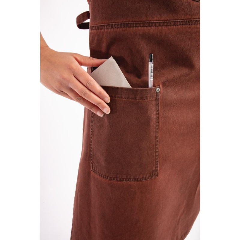 Laid-back cool, a casual yet comfortable fit and expert commercial protection from catering clothing leader Chef Works Urban characterises the durable Dorset apron Suitable for use as both a cooking apron and a server apron, the Dorset apron in rust is deceptively stylish and finished to a high artisan finish with an antique fade The distressed design is perfect for complementing interiors inspired by natural materials such as wood, clay, cork and stone or those painted with warm tones A right of centre chest pocket and two hip pockets provide plenty of storage space for busy waiters or chefs To secure the Dorset apron to support you best, simply use the long length waist ties and adjustable neck bib tie Crafted from comfortable cotton, the Dorset apron is easycare and an excellent uniform piece to protect you for the duration of your shifts