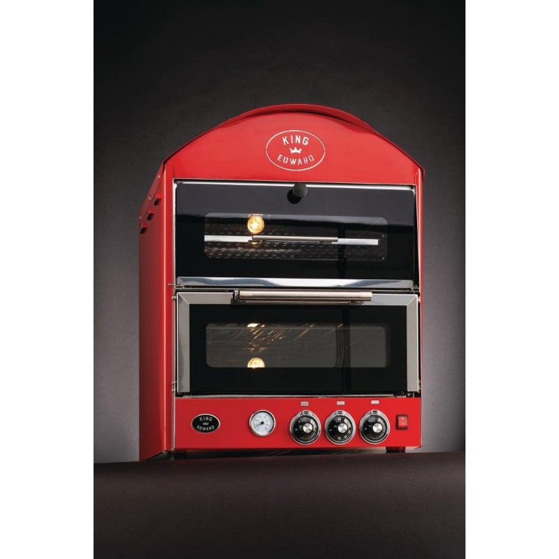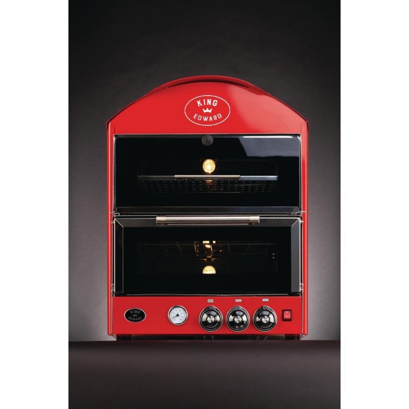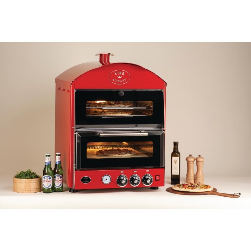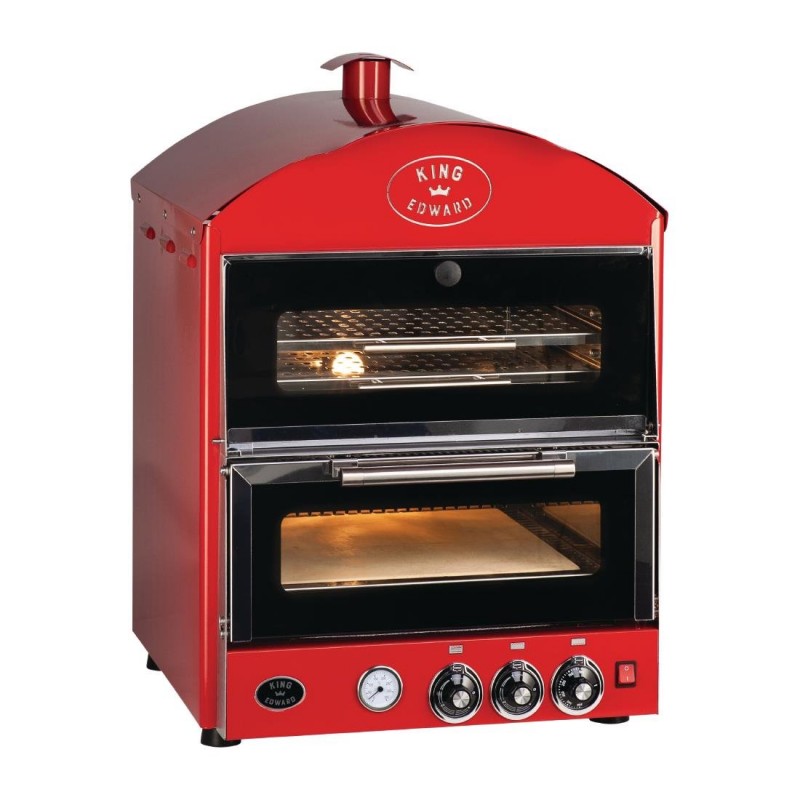 Made in Britain, the King Edward Pizza King PK1W pizza oven and warmer in red is the ideal appliance for cooking and displaying great tasting pizza in a single appliance The lower compartment is the oven itself, which has a generously sized cordierite pizza stone to cook pizza from the base Standard convection cooking also ensures a consistent cook which leaves a deliciously crispy finish and perfectly browned toppings
