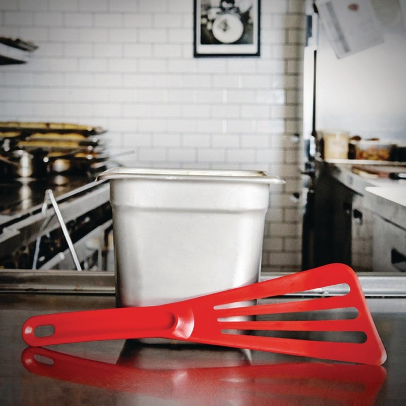 Strong, hygienic and easy to clean this red exoglass perforated spatula from Matfer can also resist temperatures up to 220 degrees Celcius, making it suitable for many cooking and preparation tasks Made from rigid exoglass, this utensil is highly robust and versatile, making it ideal for use in a commercial kitchen setting This spatula is also colour coded red for use with raw meat, helping you to avoid the risks of cross contamination
