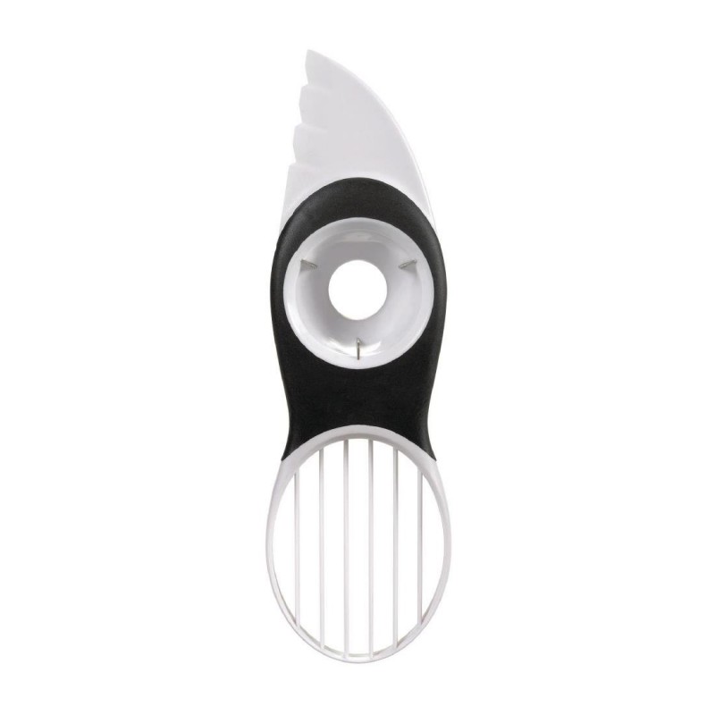 Put an end to 'avocado hand' with this highly recommended kitchen gadget from Oxo Easy to use and extremely efficient, this handy 3-in-1 tool makes avocado preparation simple and safe The avocado slicer splits, pits, slices and scoops out all the goodness, saving the use of multiple utensils This tool also helps to prevent the risks that come with using a sharp knife for the same job, but is just as easy to clean A plastic blade easily slices through the skin and flesh, but is never sharp to the touch The pitting tool needs only the simplest of twists to save you time, effort and to stop you wasting the flesh of the fruit A fan-shaped blade then allows you to scoop the remaining avocado into slices for perfect presentation, and to ensure you extract maximum value from your ingredients
