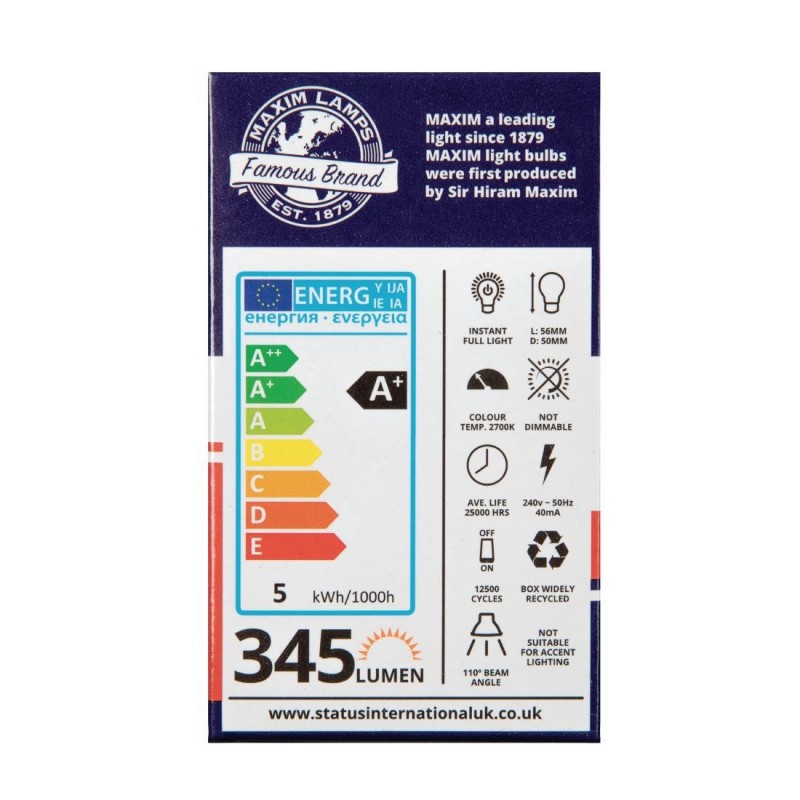 Instantly switch up the mood and atmosphere of any space with the warm white glow of these LED bulbs from Status Carrying a brightness of 345 lumens and a colour temperature of 2700K, these bulbs emit a yellow tint that can easily be compared to the warmth of incandescent bulbs, only miles more efficient and longer lasting The bulbs are perfect replacements for 50W equivalent fixtures and boast an average rated life of 25,000 hours GU10 cap fitting