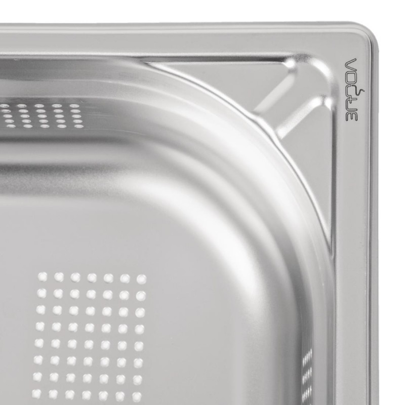 Save yourself the cost and hassle of replacement with this 100mm deep heavy duty 11 size gastronorm pan, offering a robust 304 stainless steel construction with reinforced corners This makes the pan extremely tough and able to stand up to the rigours of very day life in a busy service environment, even if dropped on a concrete floor The pan is also designed with an overhanging rim which secures it when placed in a prep, buffet station or GN pan rack Prepare, cook, store and serve food with this GN pan from trusted brand Vogue, which offers a long, reliable service life The perforations ensure that food can be steam cooked evenly, and allows moisture to escape in order to prevent sogginess