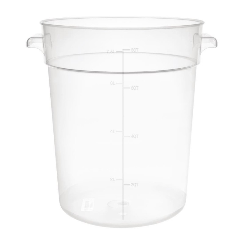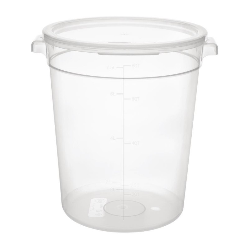Keep your food stored properly and reliably with this highly durable 7.5 litre round storage container from Vogue The polypropylene construction means the container can resist warping and shattering, giving it a long service life The tight fitting lid ensures you can keep your food fresher for longer, and cut down on waste The container is also freezer-safe, helping you keep frozen goods organised for easy stock checking Available in 3 sizes, lids sold separately