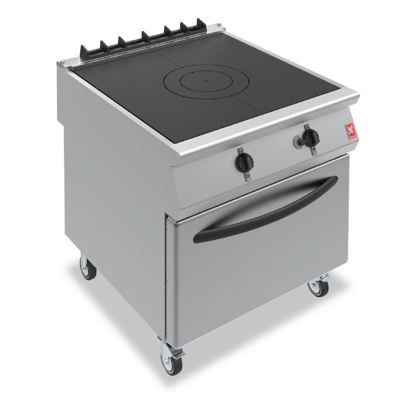 An essential addition to any professional kitchen, the natural gas Falcon F900 G9181 solid top oven range features a hugely powerful 103kW bullseye burner which delivers heat up to 450°C - ideal for the most demanding multi pan cooking The large oven compartment is fully gastronorm compatible and can accommodate 21 gastro pans over five shelf positions Temperature control is via two front mounted dial thermostats which provide precise and responsive regulation of the solid top and oven Fitted with castors for manoeuvrability and ease of cleaning