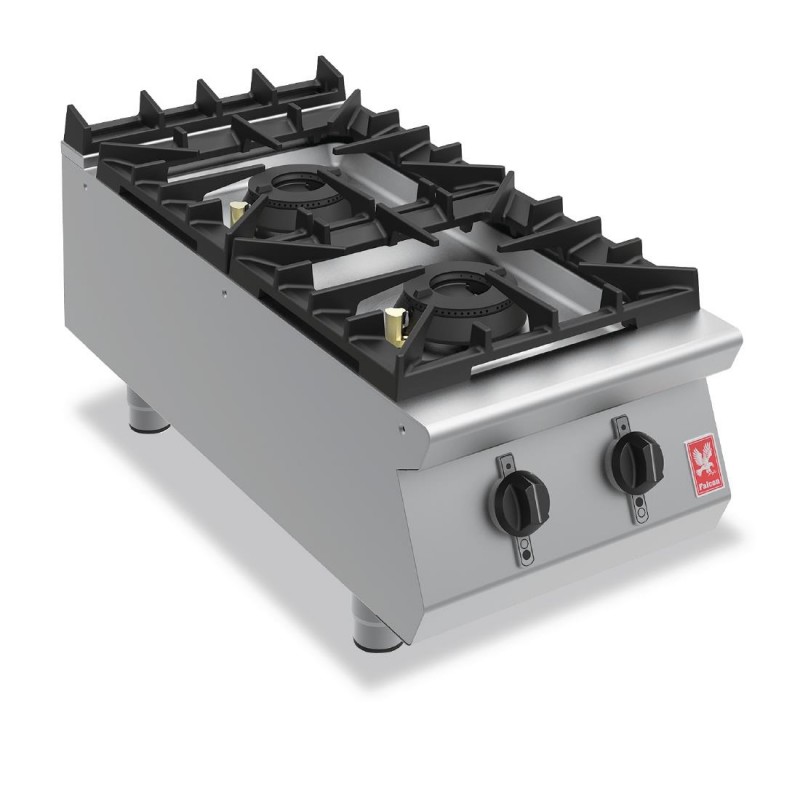 Highly powerful and ultra reliable, the Falcon F900 G9042 countertop two burner boiling hob combines impressive commercial cooking performance with attractive styling and ease of use Perfect for small and large pans alike, the hob benefits from two high performance 95kW natural gas burners, regulated using the simple front-mounted control dials The robust cast iron pan supports can be easily removed, allowing effortless cleaning and maintenance