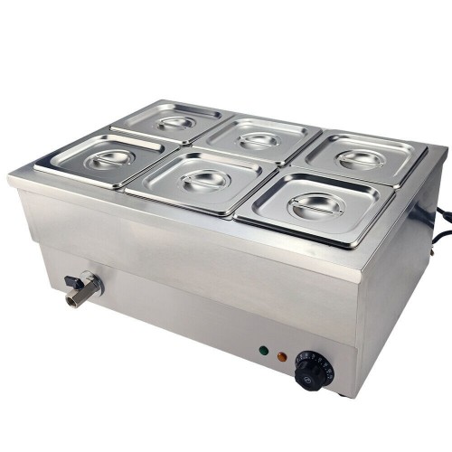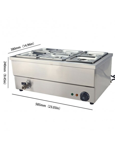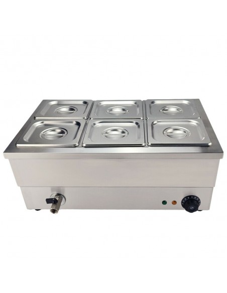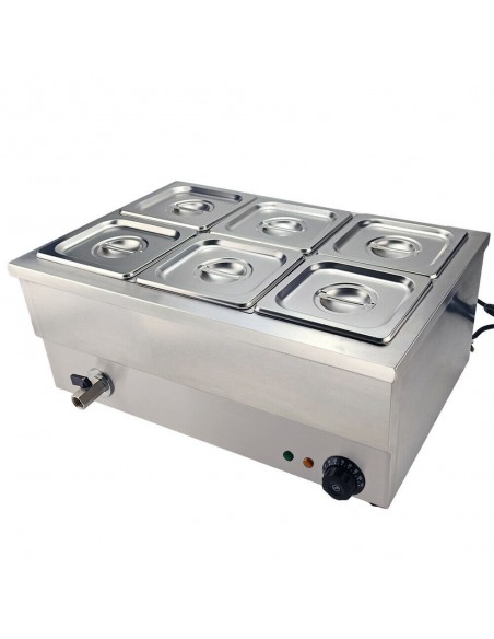 The is a wet heat bain marie supplied with 6 stainless steel pots and lids. This unit is ideal for safely holding sauces gravies and pre cooked foods for up to 2 hours at serving temperature. This Wet Heat Bain Marie Food Warmer Holder is perfect for gentle cooking, heating or storing hot food ready for serving and also prevents food from drying out, it simply ensures moist and fresh cooking results every time. The very versatile Food Warmer is an absolute ultimate value for money, great for buffet service and parties where bulk food at ideal temperatures is required.
