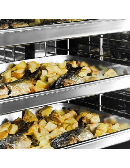 This commercial electric convection oven with humidification is designed to deliver consistent, high-quality cooking results while maintaining excellent energy efficiency. Ideal for cafés, bakeries, restaurants, catering kitchens and food production environments, it combines precise temperature control, indirect steam generation and a compact, stackable design.