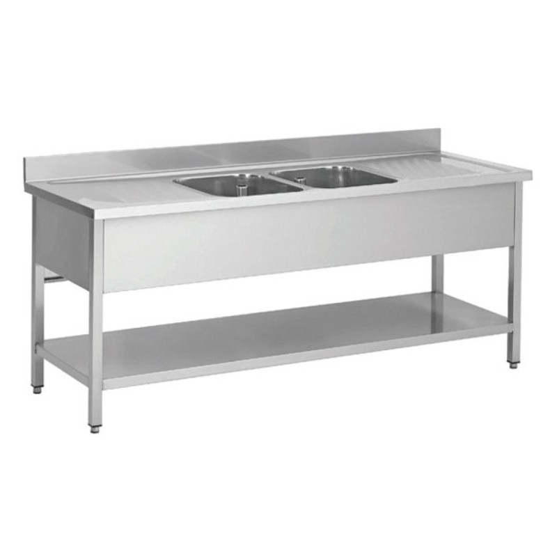 This Double Sink with Double Drainer 2000mm Wide Improves your cleaning facilities, with this double sink with double drainer. The sink is constructed from a highly durable and easy to clean stainless steel material, that helps to save you money on replacements or maintenance and time spent on cleaning. The sinks can be used to efficiently clean a wide variety of table or glassware - with the ability to use one sink for cleaning and the other for rinsing. This sink unit features an undershelf that can be used to save you vital storage space by allowing for cleaning chemicals, equipment and other items to be safe shelved. The unit is delivered flat-packed which requires self assembly.