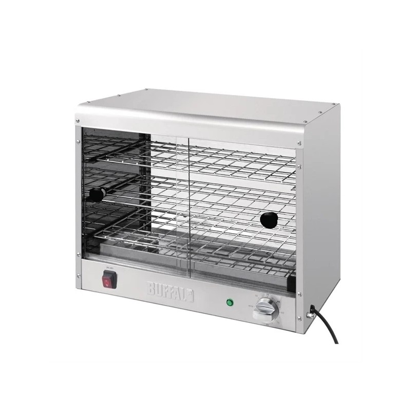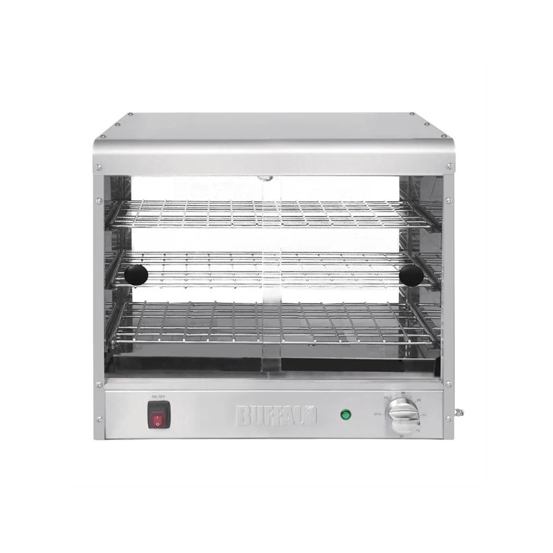 Designed to hot hold up to 30 pies at a time, this Buffalo pie cabinet is the perfect addition to any pub, restaurant, takeaway or service station which wants to offer delicious piping hot pastries. The cabinet is constructed with a powerful heating lamp that effectively keeps the contents at the perfect serving temperature. This, combined with the built-in water pan, ensures pastries are kept warm and appealing - preventing the pastry from drying out. With easy-to-use dial controls, the pie cabinet allows you to quickly adjust the temperature to suit the contents - so you've got the accuracy and precision to hold a wide variety of foods.