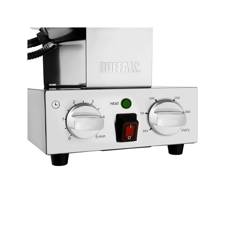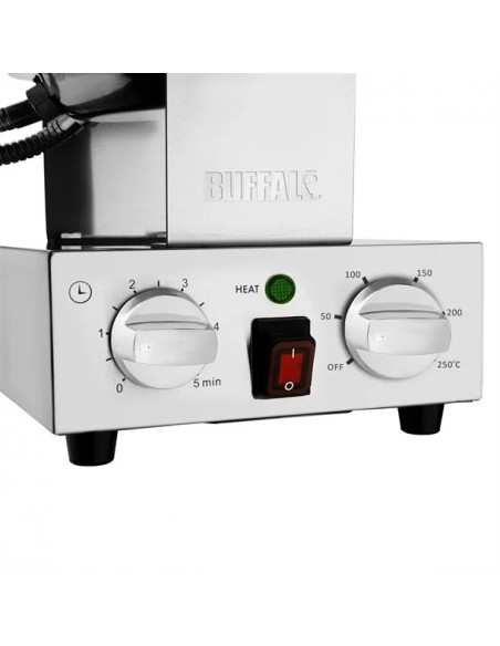 Buffalo DK229 Perfect for creating delicious desserts, the Buffalo Bubble Waffle maker makes it easy to bake light, fluffy and crispy waffles. Simply turn on and add your waffle mixture. The non-stick plates ensure mess-free operation, whilst the dial thermostat and timer provide you with the accuracy to get consistent cooking results every time. The high 30 waffles per hour output is more than enough for busy restaurants, pubs and food stands, and thanks to the durable commercial design, the waffle maker is exceptionally reliable and easy to clean - essential considerations for any food service site.