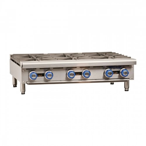 Compact yet hardworking, this 36 inch countertop open burner will deliver adaptability to your busy kitchen environment. Its PyroCentric burner heads produce two rings of flame for even heating, no matter the size of the pan. The unit comes equipped with one standing pilot per burner for instant ignition, and cast iron grates that provide a long service life. The back grates are sized for positioning large pans and stock pots directly over the burner, and feature a hot air dam which deflects heat on to the pan. Its large 5" stainless steel landing edge is ideal for convenient plating, and the removable burners and grates make cleaning painless.