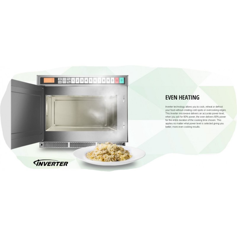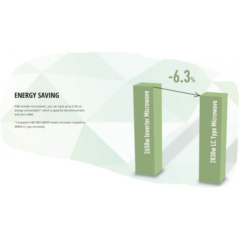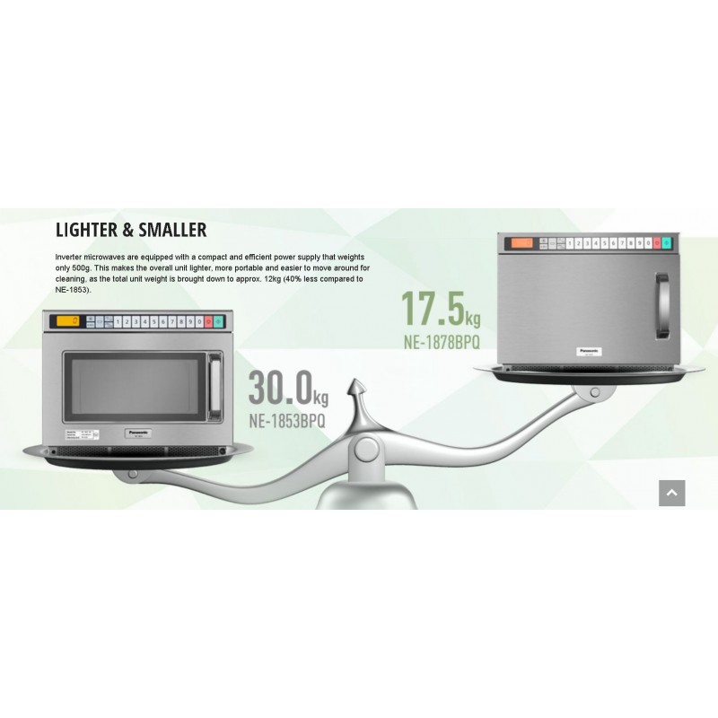 The Panasonic NE-1878 is equipped with Panasonic's unique Inverter technology, which enables faster, more even, gentler cooking. It also uses less energy and the all-metal door design ensures easy cleaning, extending the lifespan of the microwave.