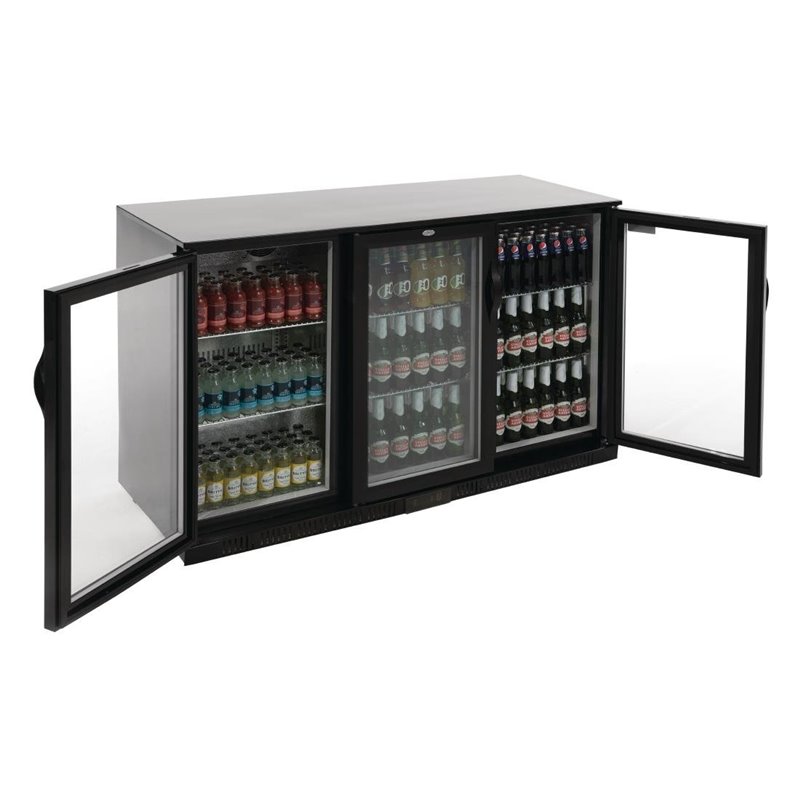 Polar GL004 G-Series Back Bar Cooler with Hinged Doors 330Ltr, With its vast capacity of up to 270 bottles over six sturdy adjustable shelves, the Polar G-Series triple door beer fridge is perfect for merchandising and storing refreshing drinks in busy bars, hotels or pubs.
