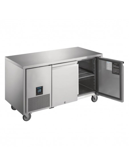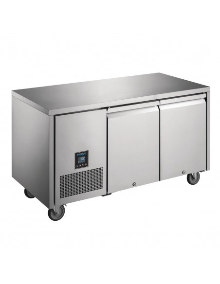 With the ability to excel in the most busy, commercial environments, this double-door counter fridge from Polar's U-Series is built to last through the most rigorous of use. The fridge is designed with intelligent controls that allow you to switch between meat (-2°C to +2°C), fish (-1°C to +1°C) and general storage (+1°C to +4°C) pre-sets at the touch of a button - making it easier to change temperatures to match your seasonal menu. Utilising space is vital within the kitchen, and that's why this double fridge is constructed with anti-tilt, E-shaped shelf supports that allow you to house shelving and 1/1GN pans in the same place - giving you more space to store the produce that you need.
