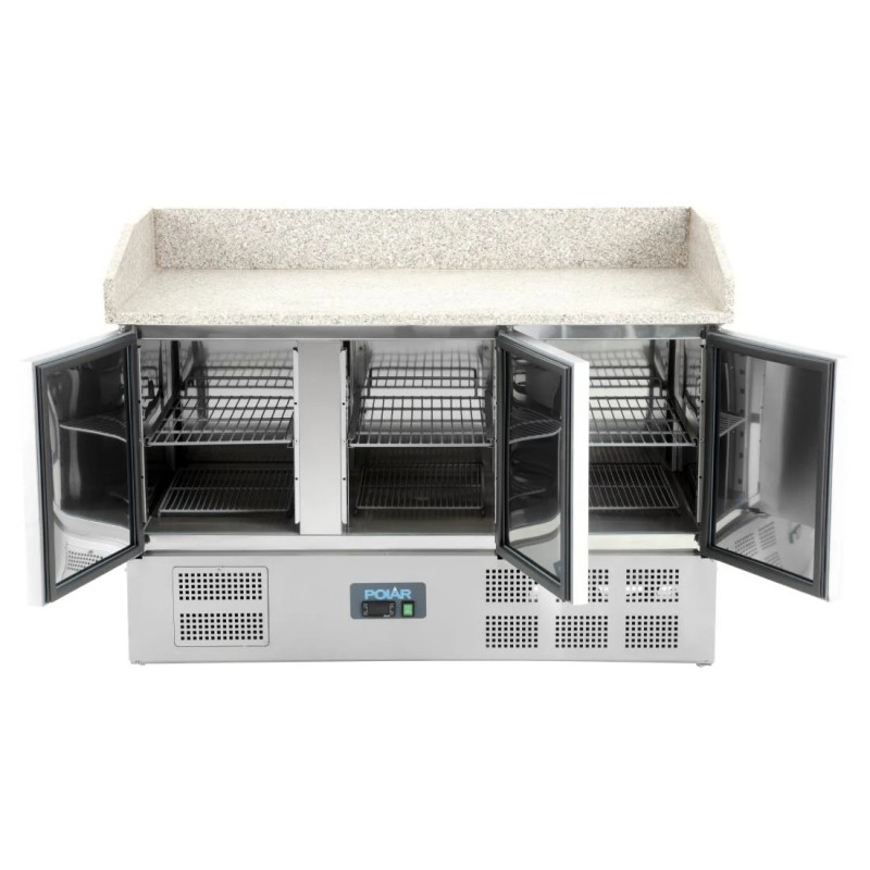 Polar CN402 Keep your ingredients close to hand and easily accessible with the Polar G-Series pizza prep counter. By combining reliable chilled food storage capacity alongside an incredibly strong and sturdy granite prep top, it's easy to roll dough, as well as prep other favourites such as wraps, sandwiches or salads. Behind each door is a single shelf and floor protector, chilled by powerful forced air cooling. This gives you reliably cool storage, even when the doors are being opened frequently. Digital controls and handy auto-defrost make the counter easy to use, clean and maintain, whilst the strong stainless steel construction more than meets the needs of any busy pro kitchen.