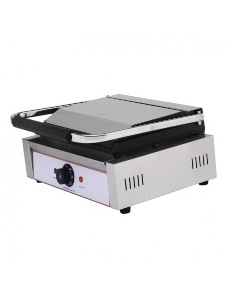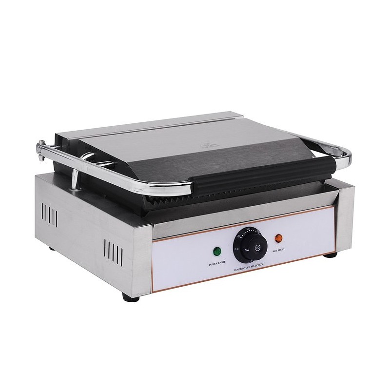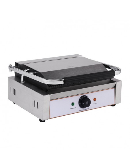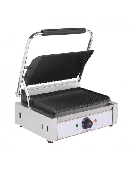 This electric Contact Grill Double / Ribbed Panini Grill is a great value Bistro Contact Grill. It has a robust, stainless steel structure with ribbed cast iron plates for long-term usage and grilling, and it's perfect for burgers, steaks, paninis and toasted sandwiches in busy restaurants. You have complete control over the entire grilling process with an adjustable swivel head and a changeable heat knob for varied thicknesses and temperatures.