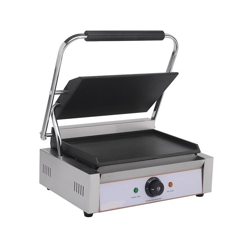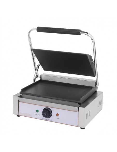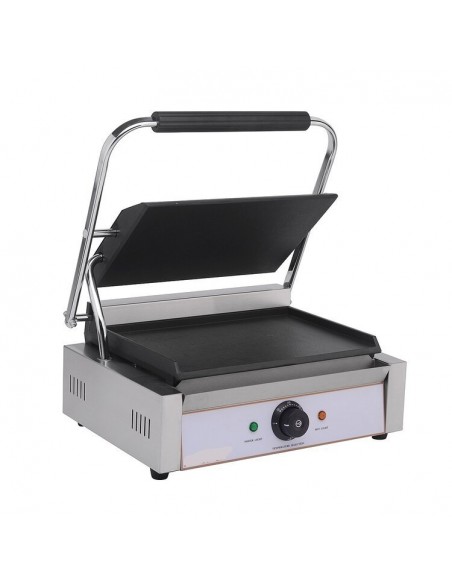 This electric Contact Grill Double / Smooth Panini Grill is a great value Bistro Contact Grill. It has a robust, stainless steel structure with flat cast iron plates for long-term usage and grilling, and it's perfect for burgers, steaks, paninis and toasted sandwiches in busy restaurants. You have complete control over the entire grilling process with an adjustable swivel head and a changeable heat knob for varied thicknesses and temperatures.