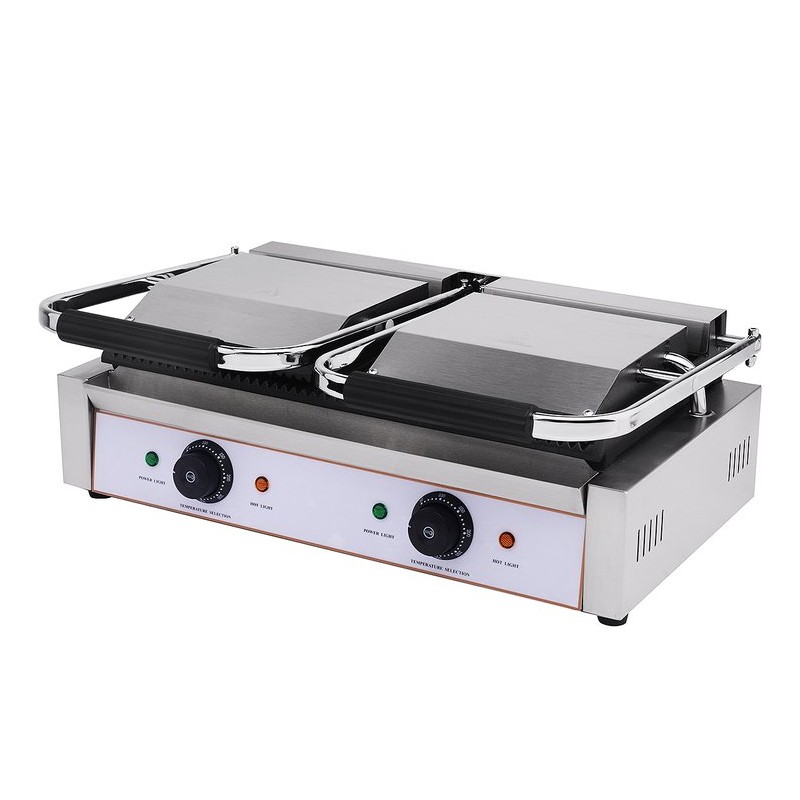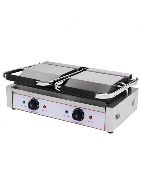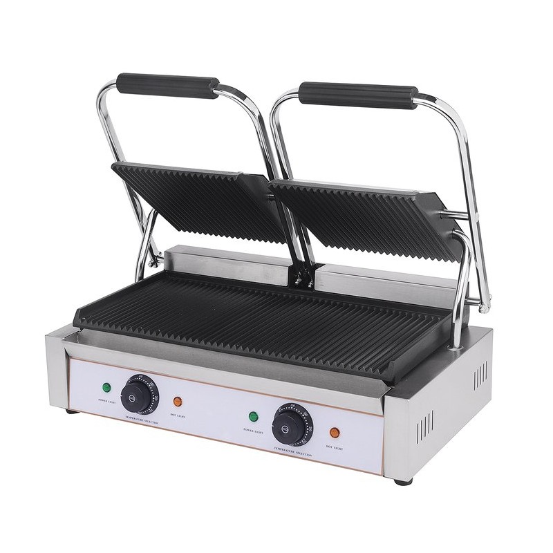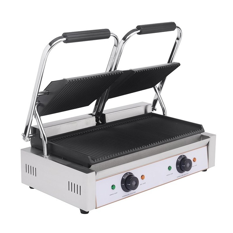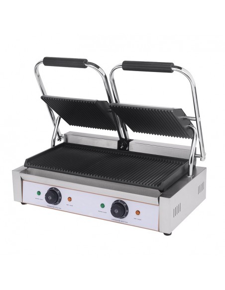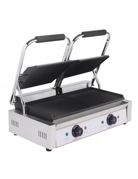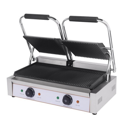 Contact Grill Double - Ribbed Top is a great value Bistro Contact Grill. It has a robust stainless steel structure with ribbed cast iron plates for long-term usage and healthy grilling, and it's perfect for burgers, steaks, paninis, and toasted sandwiches in busy restaurants. You have complete control over the entire grilling process with an adjustable swivel head and a changeable heat knob for varied thicknesses and temperatures.