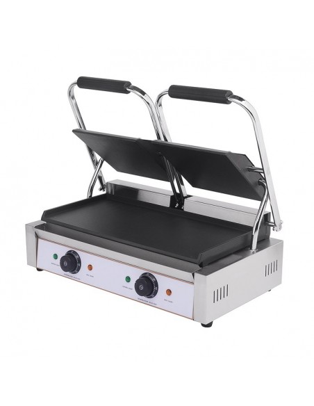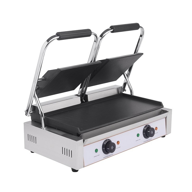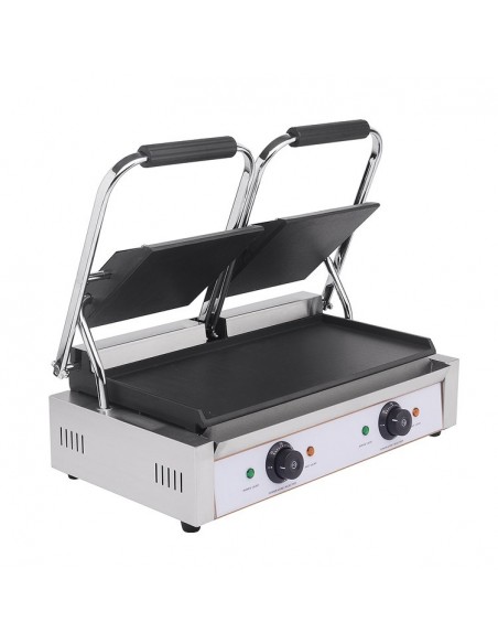 Contact Grill Double - smooth plates is a great value Bistro Contact Grill. It has a robust stainless steel structure with ribbed cast iron plates for long-term usage and healthy grilling, and it's perfect for burgers, steaks, paninis, and toasted sandwiches in busy restaurants. You have complete control over the entire grilling process with an adjustable swivel head and a changeable heat knob for varied thicknesses and temperatures.