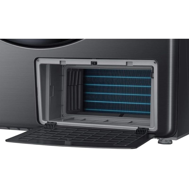The Samsung DV16T8520BV commercial heat pump tumble dryer has an exterior, which is carefully finished with a Black Caviar Colour whilst the front door is tinted in a Black Deco. This top of the range Samsung commercial heat pump Dryer also comes with a Interior Drum Light as well as a Filter Check Indicator.