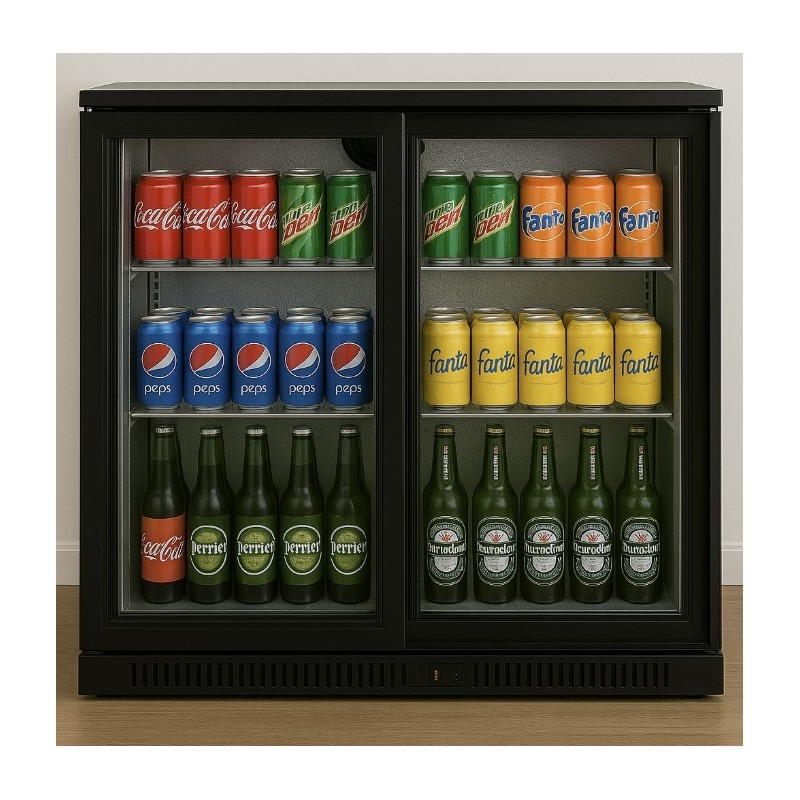 Back Bar Cooler with 2 Sliding Doors – 220L Black Undercounter Bottle Fridge for Efficient Beverage Storage and Display