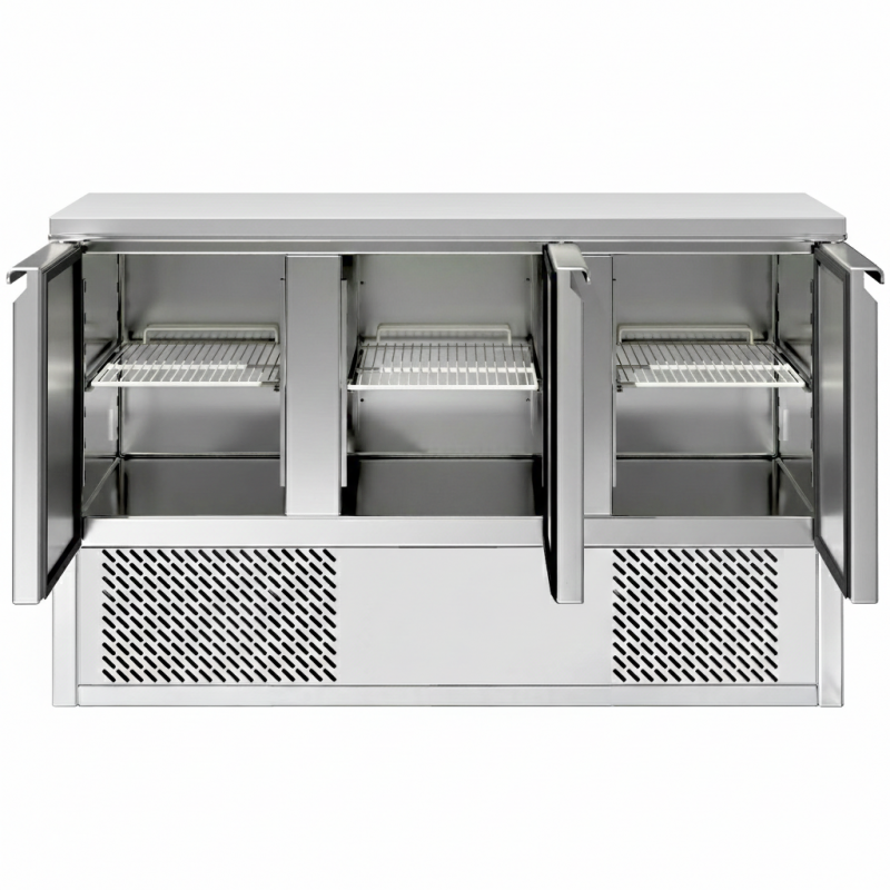 The 3-Door Refrigerated Counter (368 Litres) is designed to deliver reliable, energy-efficient refrigeration while doubling as a spacious prep station. Built from high-grade stainless steel, this commercial counter fridge is perfect for restaurants, hotels, cafes, and catering kitchens that need performance, durability, and convenience in one unit.