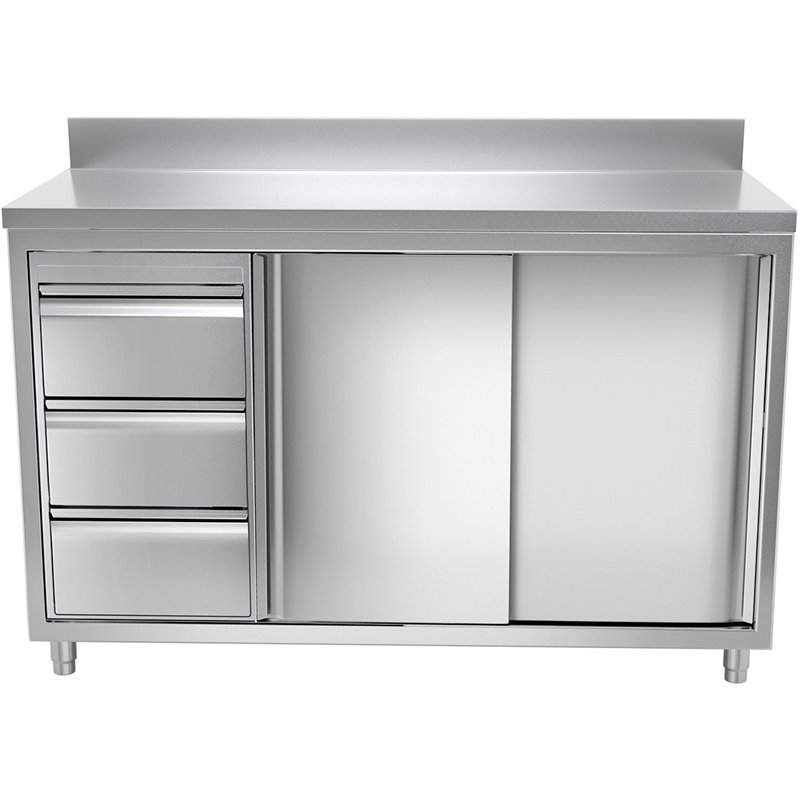 Commercial Worktop Floor Cupboard 3 drawers Left 2 sliding doors Stainless steel Width 1600mm Depth 600mm Upstand | DA-THASR166L