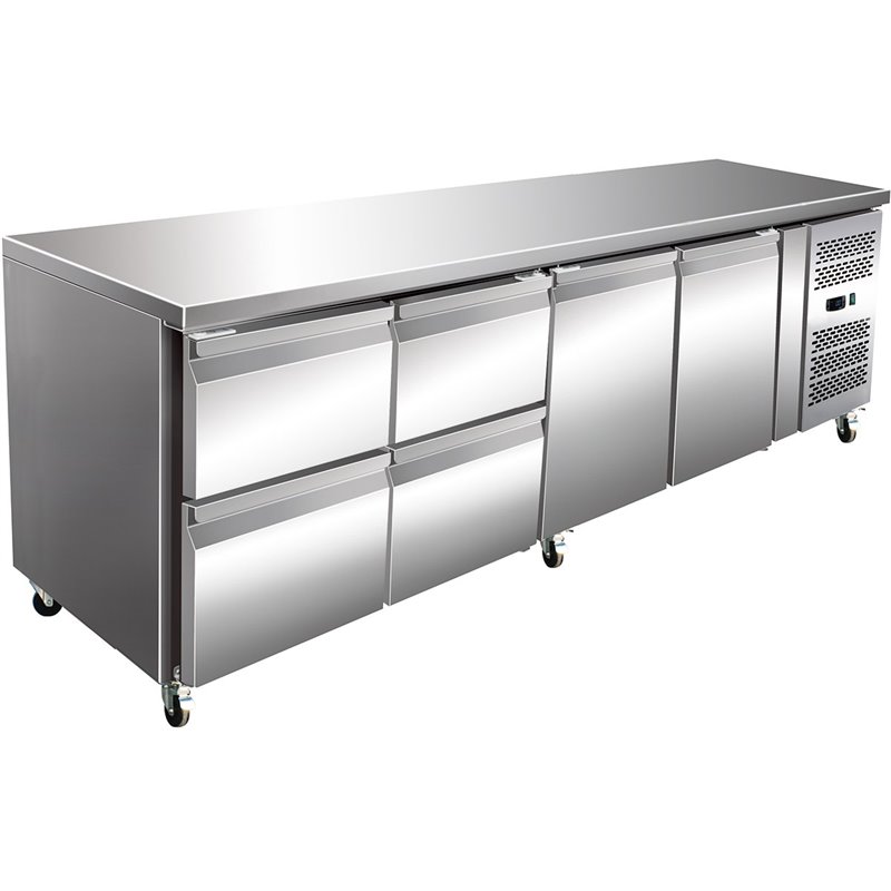 Counter chiller with 2 doors and 4 GN drawers and 4 castors included. This restaurant bench fridge also comes with a range of useful features which are certain to make life in your catering and professional kitchen considerably simpler.