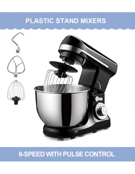 - Equipped with three accessories including wire whipper, dough hook, flat beater with transparent splash bowl cover offering mixing versatility to blend, beat, whip,knead, mix eggs or cream.