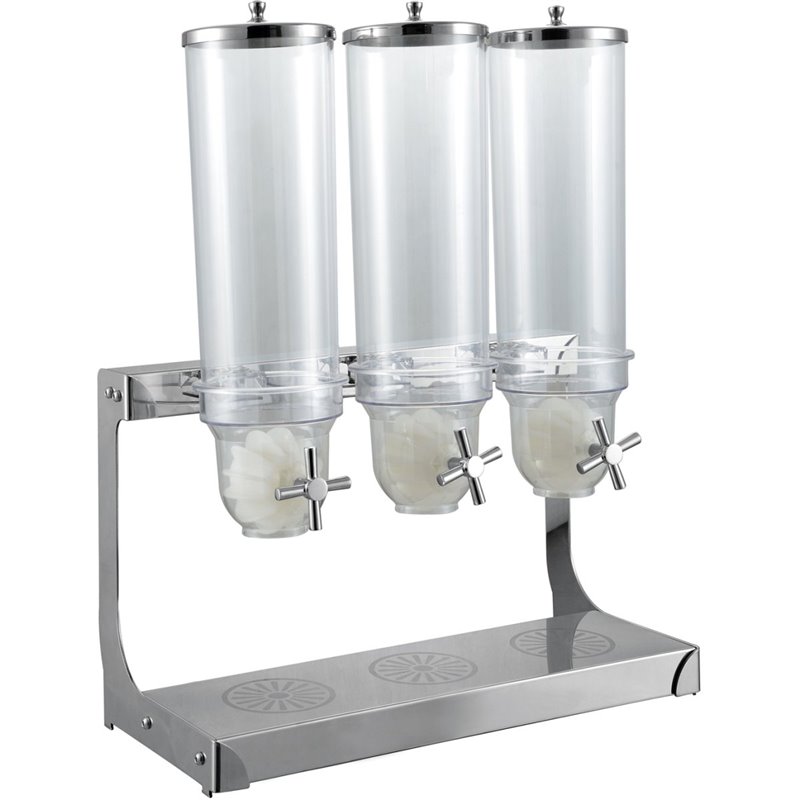 This professional triple cereal dispenser is designed to hold up to up to 9 liters of product. Use it at your hotel breakfast bar or buffet to serve up delicious cereals, granola or snacks. It's perfect for cafes and bistros, too! Use it as a snack food or cereal dispenser in your employee break room, or to dispense candy at your convenience store. The options are endless with this dispenser!