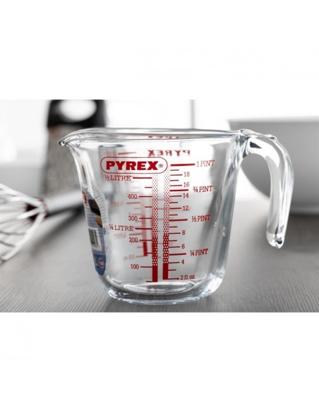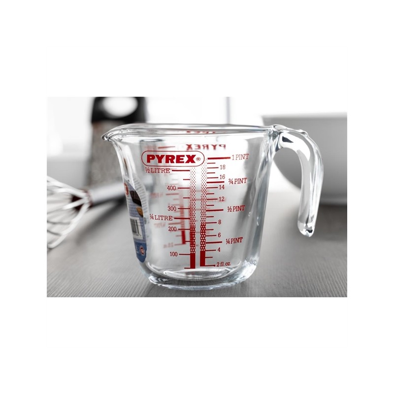 Perfect for any small measuring or pouring task, this Pyrex measuring jug is a must-have in any kitchen. Made from strong and robust glass, this sturdy 500ml jug features easy-to-read measurements in ml, oz and pints. Designed with a large handle and spout, it's as useful for carrying and pouring liquids as it is for measuring them - all without any spills or mess. Safe for use in microwaves, fridges, freezers and ovens, this multipurpose jug is a true all-rounder that can be used at every stage of your food preparation process.