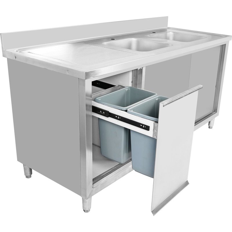 Commercial Double Sink Cupboard Stainless Steel 1800x700x900mm 2 Bowls Waste Bin Splashback | DA-DSD18702D2WBR