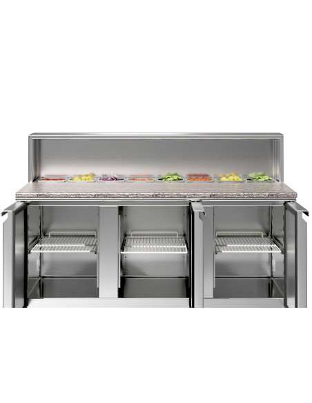 Upgrade your kitchen efficiency with this spacious and durable pizza prep counter, ideal for busy commercial kitchens, pizzerias, and sandwich bars. Built for performance and practicality, this refrigerated preparation table combines a robust granite worktop with generous chilled storage to streamline your food prep process.