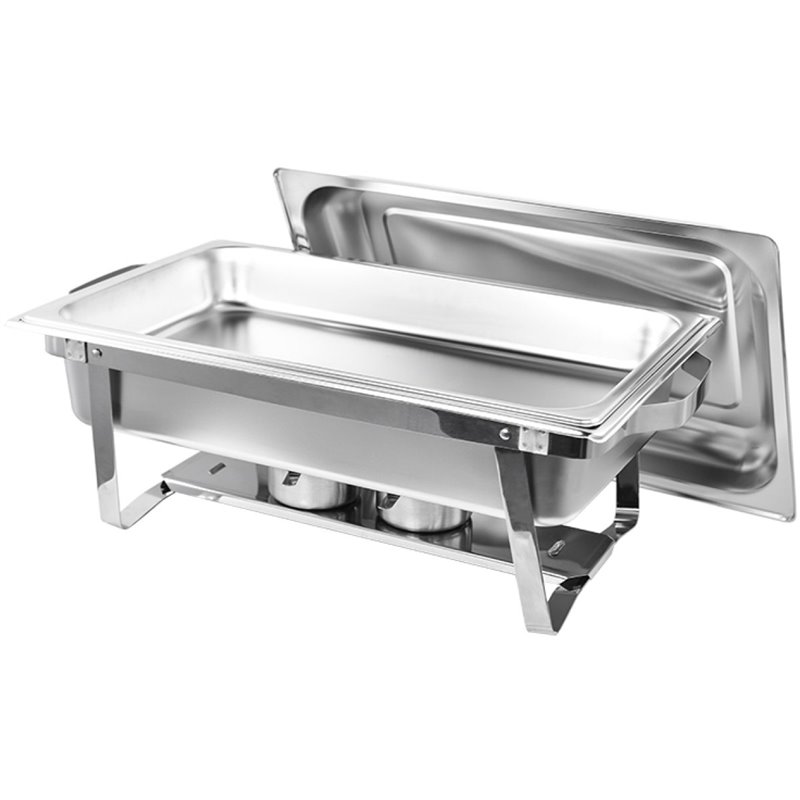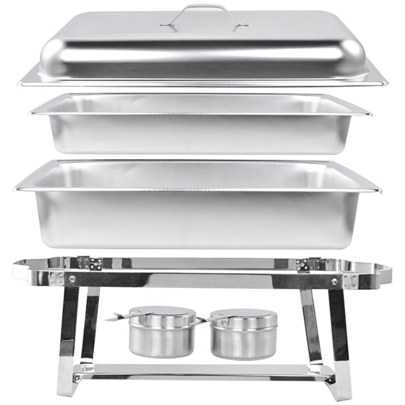A commercial stainless steel 1/1 gastronorm sized professional chafer set with water pan, nine litre food pan, cover and two fuel holders. The chafing set features a 9Ltr, 1/1 GN pan that is ideal for serving large quantities of food during buffet services or large-scale events - perfect for serving multiple customers without the need for constant restocking.