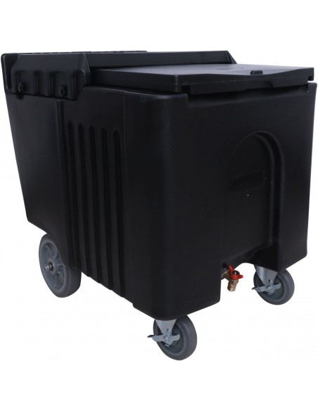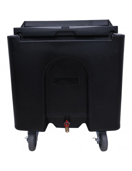 This 125 lb. black mobile ice bin is perfect for catering events and restaurants, as well as indoor and outdoor bars to help limit multiple long trips to the kitchen for ice refills! It can also be used to keep bottled beverages chilled while merchandising or at any catering event. It will fit easily under standard 35" counters to save space at your busy venue.