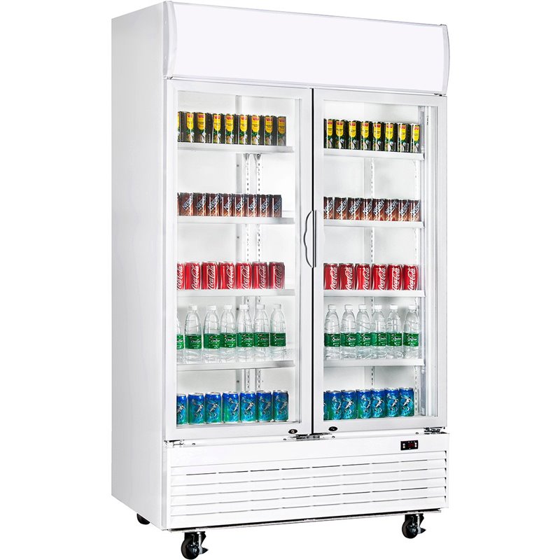 Large capacity double glass door upright display fridge. An easy to clean, low maintenance high quality refrigerated bottle cooler and ideal as a multi functional drinks refrigerator.