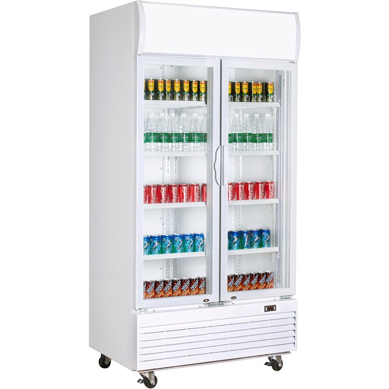Large capacity double glass door upright display fridge. An easy to clean, low maintenance high quality refrigerated bottle cooler and ideal as a multi functional drinks refrigerator.